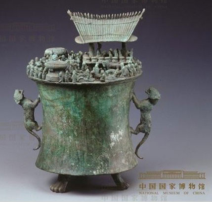 有一件貯貝器表現(xiàn)的是殺人祭祀的詛盟場(chǎng)面:廣場(chǎng)上陳列著大銅鼓,人頭洶涌,作為祭祀的奴隸被捆住,在柱子上盤(pán)繞的巨蛇即將吞噬他,神氣活現(xiàn)的女奴隸主坐在轎子上已經(jīng)駕臨,祭祀即將開(kāi)始。
