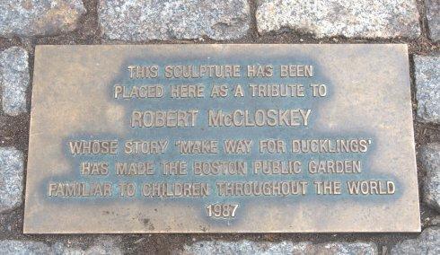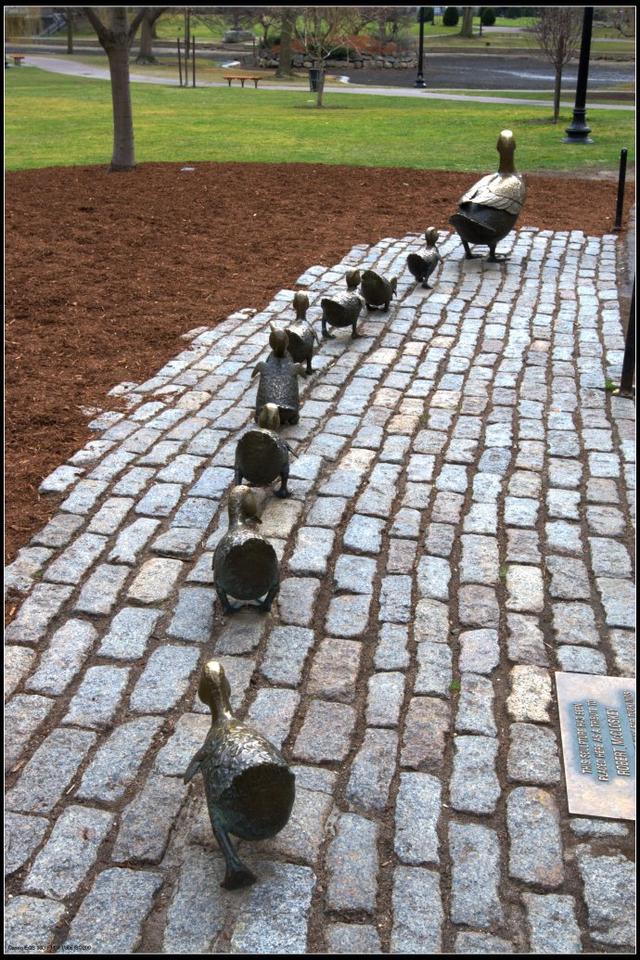 波士頓畫家羅伯特·麥克克洛斯基畫過一本經(jīng)典的兒童書《讓路給小鴨子》 (Make Way for Ducklings),講述一群野鴨子在波士頓市民的愛護(hù)下穿過車流,成功從查爾斯河邊走到波士頓公共花園安家的故事。