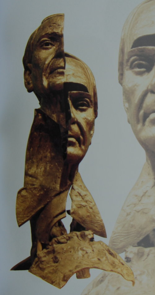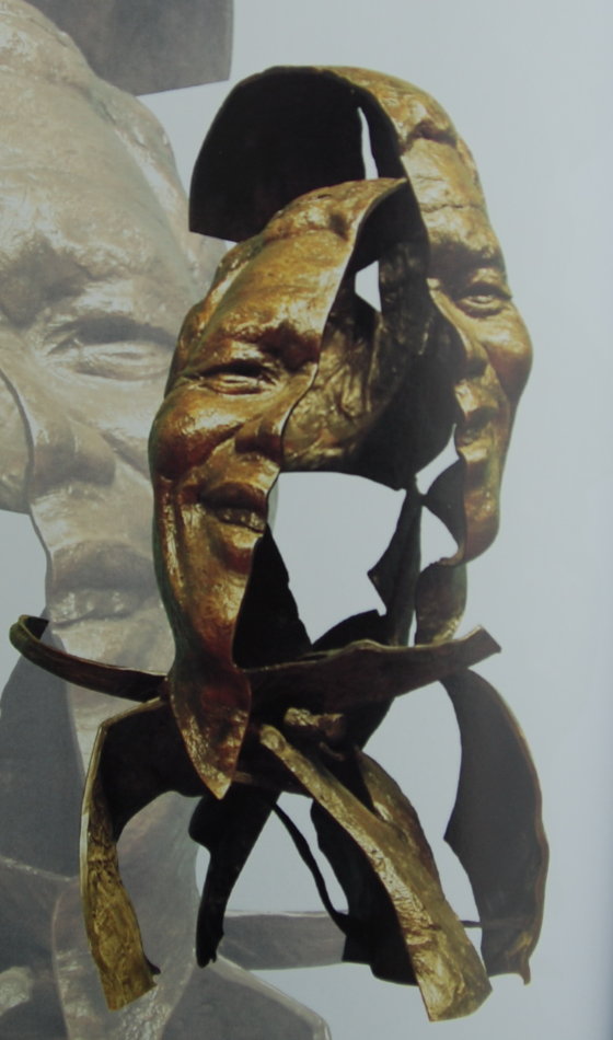 細(xì)看薛林納為名人制作的頭部塑像中,盡管各不相同,各有特色,但有一個(gè)共同的“薛林納語(yǔ)言”,那就是這樣名人的臉部大多從中央一劈為二,分成左右兩爿,愛(ài)因斯坦、畢加索、亨利·摩爾、曼德拉都有被分裂,被扭曲的形象。或許,薛林納想告訴大家,即使是偉人的人物,他們的性格也有兩面性;他們的左傾和右傾思想常常合二為一,卻又相對(duì)獨(dú)立;他們有成功光亮的一面,也有失敗困擾的一面。而這,才是完整的人生,才是他們真正的面貌。