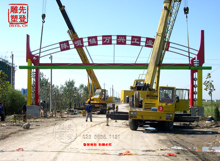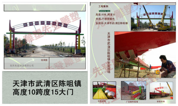 成功案例:不銹鋼大門雕塑安裝于天津市武清區(qū)陳咀鎮(zhèn),高度10米,跨度15米,不銹鋼大門雕塑