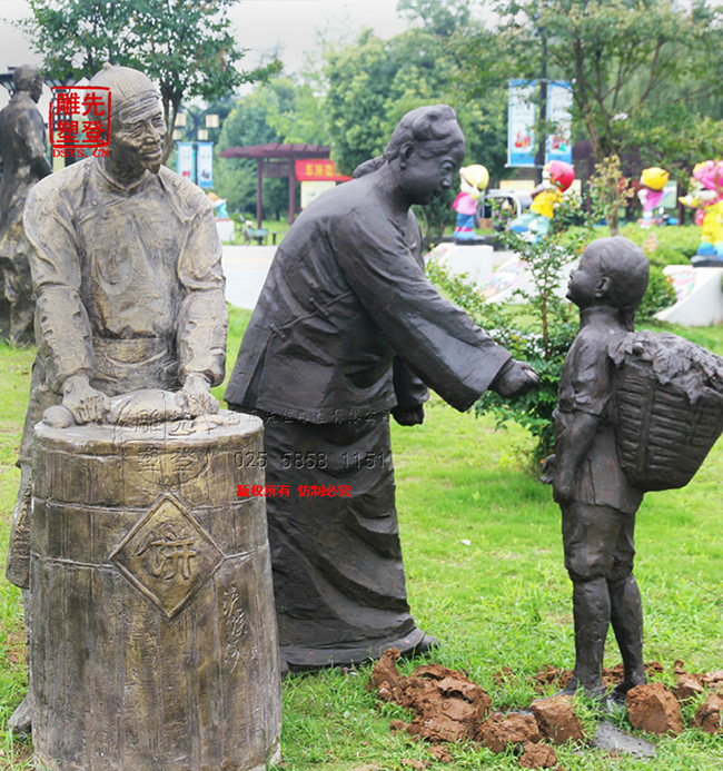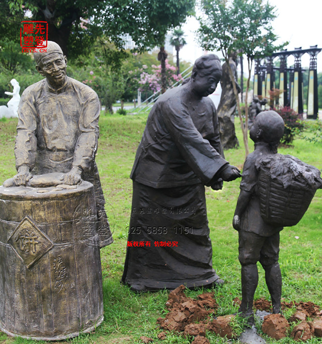 雕塑寓意:老街上賣燒餅的老夫妻已經(jīng)在這里擺攤賣餅許多年了,這些年一直都是價廉物美。遇見無錢買餅的小孩就送他一塊。